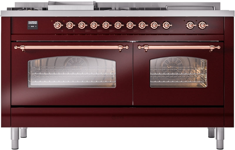 ILVE Nostalgie II 60" Dual Fuel Propane Gas Range in Burgundy with Copper Trim, UP60FSNMPBUPLP