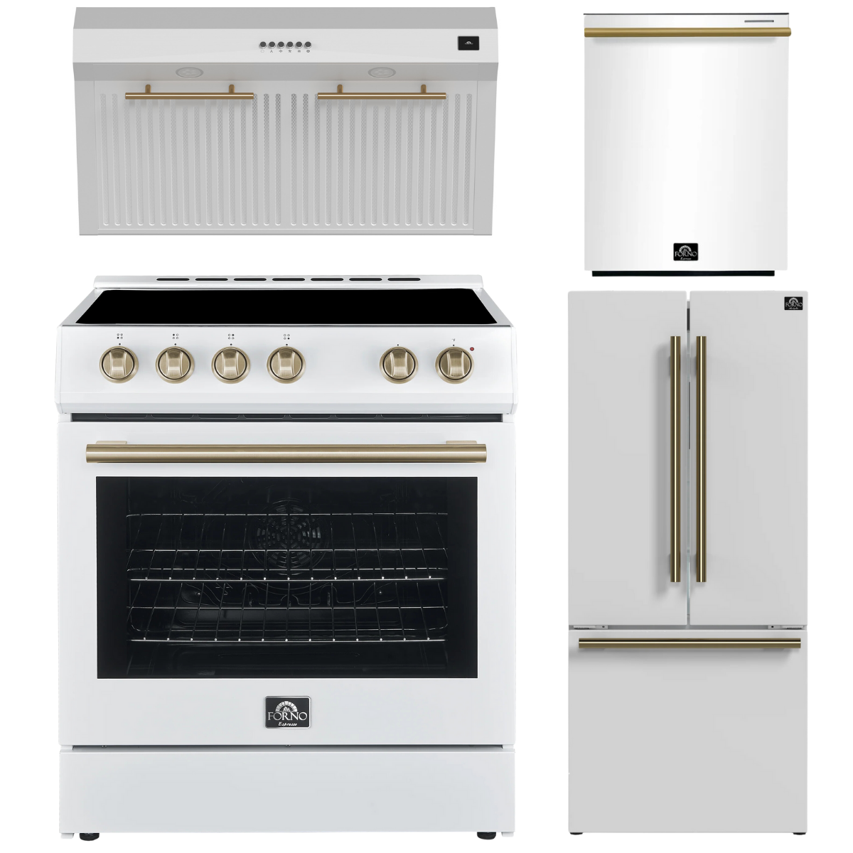 FORNO Espresso Package - 30" Electric Range, Range Hood, 30" Refrigerator with Ice Maker and Dishwasher in White with Antique Brass Accents