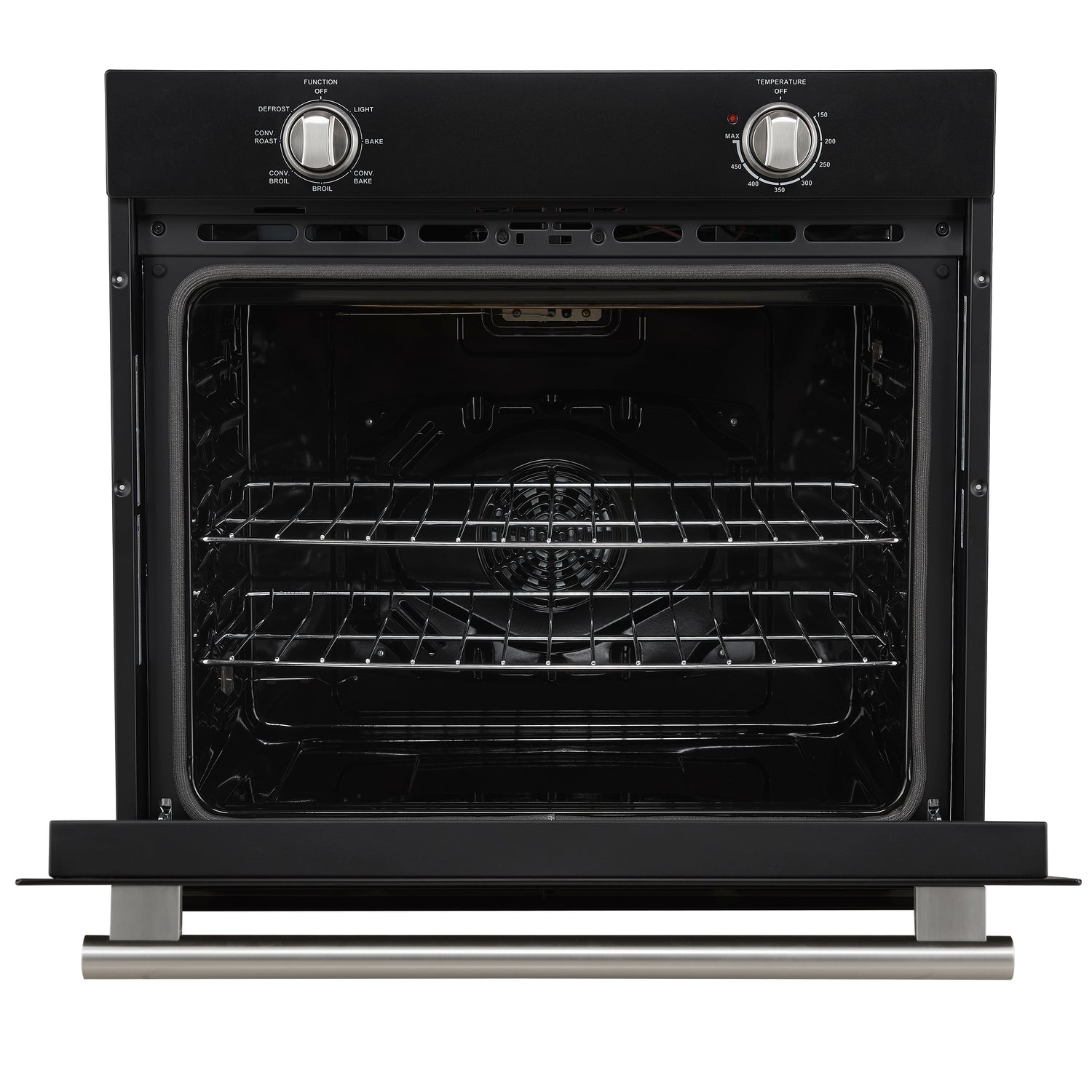 The Forno Vomero 30" Black Wall Oven is designed to handle everything from quick weeknight dinners to elaborate holiday feasts. With a spacious 5 cu. ft. capacity, it offers six versatile cooking modes: Bake, Convection Bake, Broil, Convection Broil, Convection Roast, and Defrost powered by a 2000W broiler, 1500W bake element, and a 50W convection fan for fast, even heating. Featuring six adjustable rack positions and an intuitive mechanical knob control panel, it allows for effortless temperature and function adjustments, while the durable enamel interior and concealed heating elements simplify cleaning without compromising its sleek, modern design. Perfectly suited for both everyday use and special occasions, this oven combines functionality, versatility, and contemporary style, making it a standout centerpiece in any kitchen.