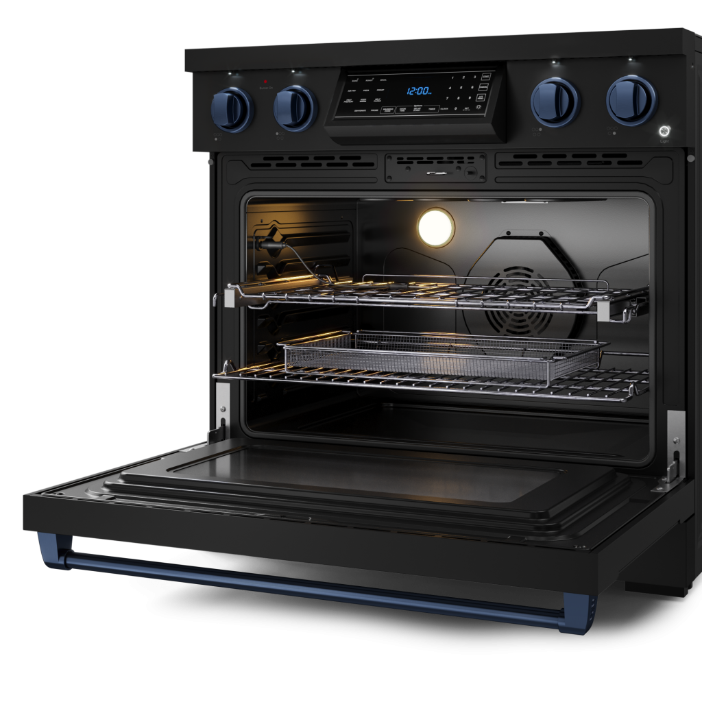 Gordon Ramsay by THOR Kitchen 36" 6.0 cu. ft. Professional Electric Range with Tilt Panel Touch Control, Self-Clean and Air Fry in Matte Black with Navy Blue Accents, RSE36B-BLU