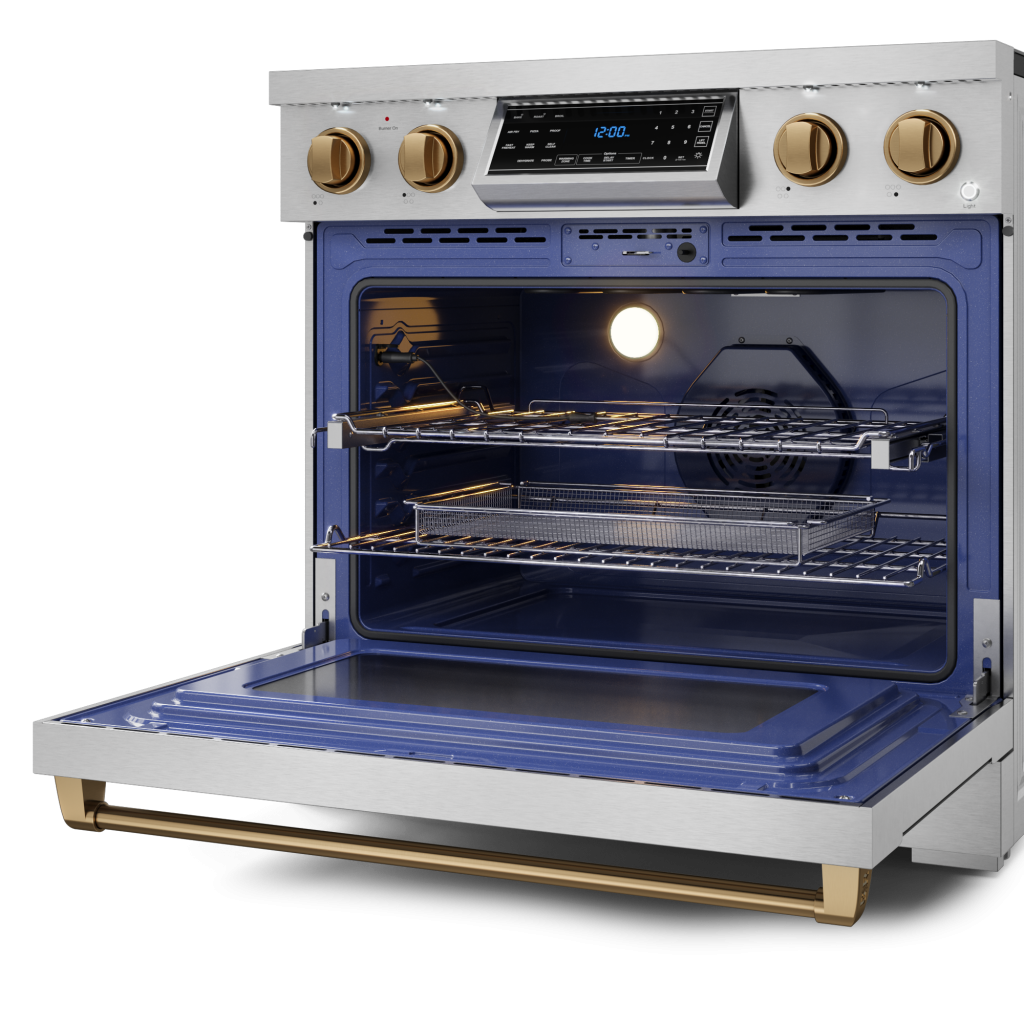 Gordon Ramsay by THOR Kitchen 36" 6.0 cu. ft. Professional Electric Range with Tilt Panel Touch Control, Self-Clean and Air Fry in Stainless Steel with Bronze Accents, RSE36-BRZ
