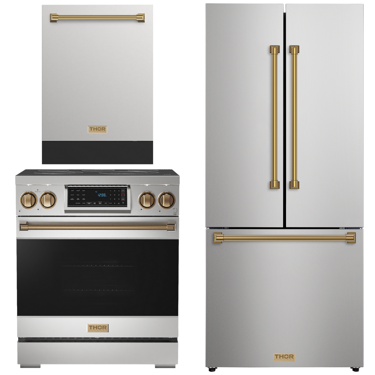 Gordon Ramsay by THOR Kitchen Package - 30" Electric Range, 30" Refrigerator with Ice Maker and Dishwasher in Stainless Steel with Bronze Accents, AP-RSE30-BRZ-1