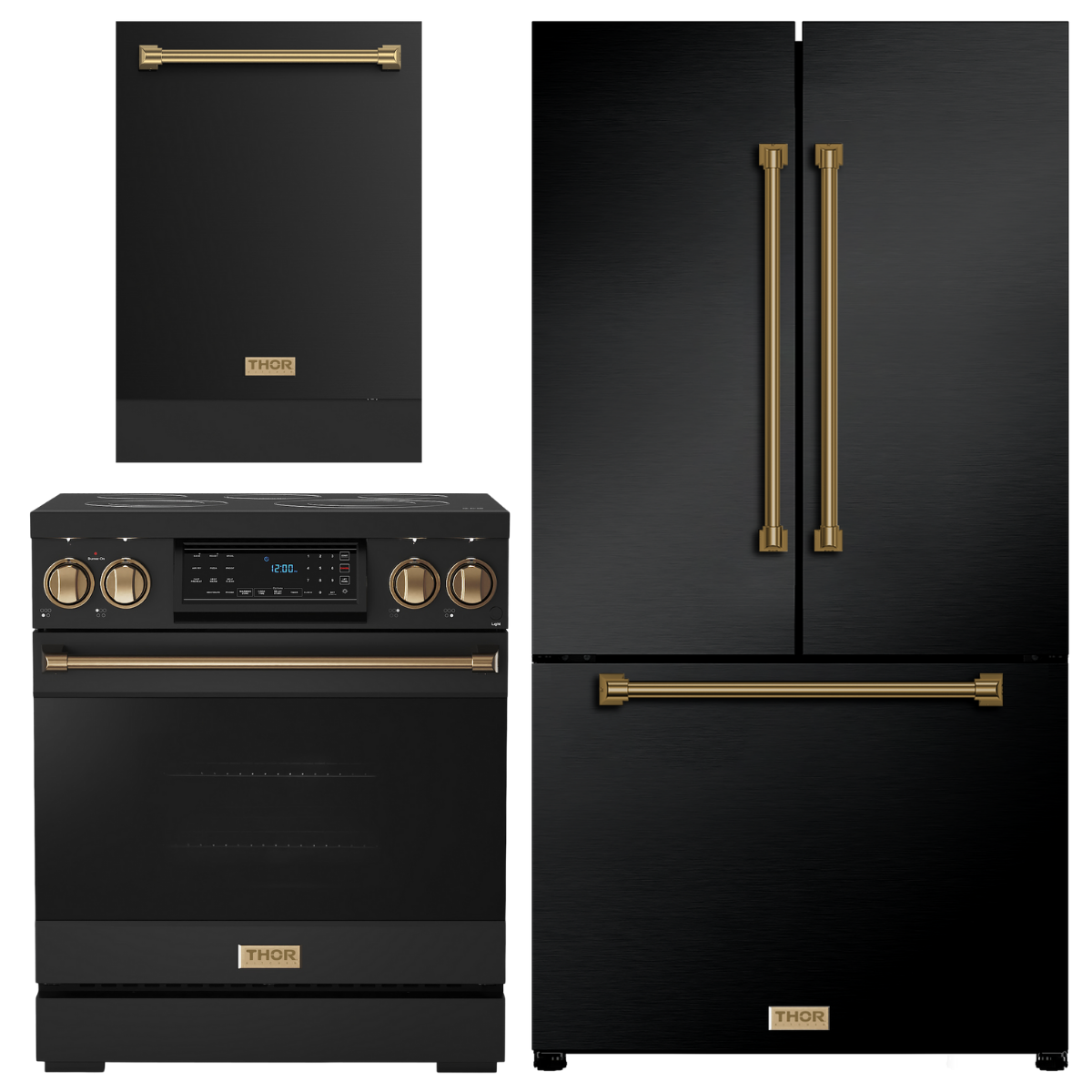 Gordon Ramsay by THOR Kitchen Package - 30" Electric Range, 36" Refrigerator with Ice Maker and Dishwasher in Black Matte with Bronze Accents, AP-RSE30B-BRZ-2