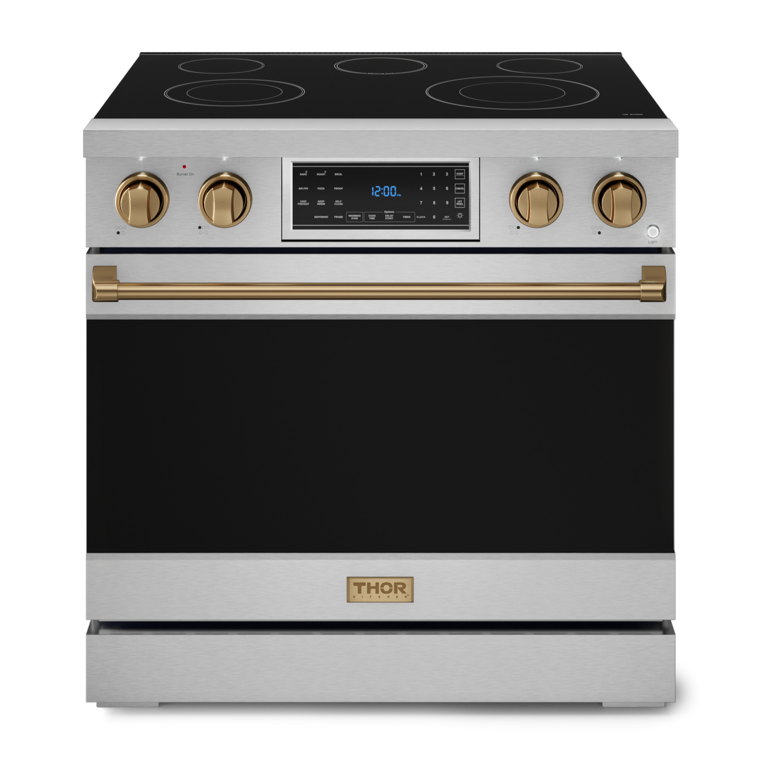 Gordon Ramsay by THOR Kitchen Package - 36" Electric Range, 36" Refrigerator with Ice Maker and Dishwasher in Stainless Steel with Bronze Accents, AP-RSE36-BRZ-2