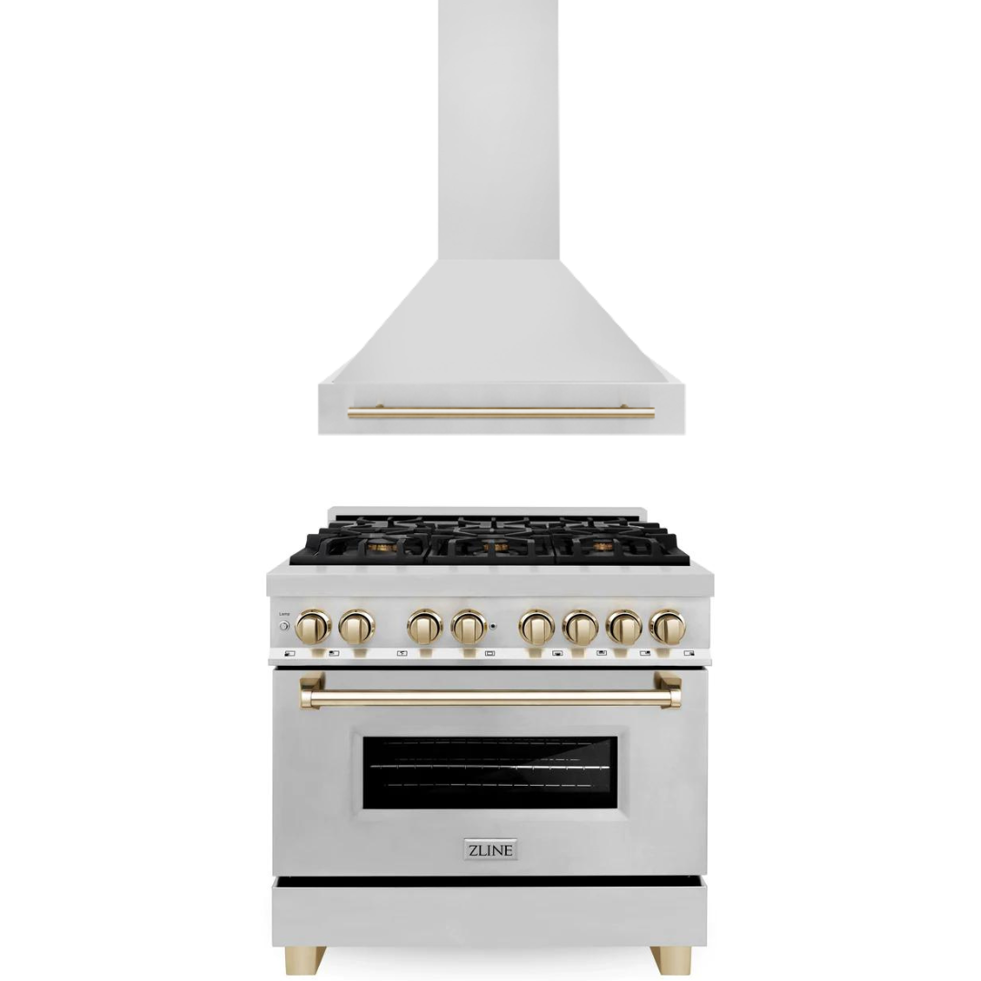 ZLINE Autograph Package - 36 In. Dual Fuel Range, Range Hood in Stainless Steel with Gold Accents, 2AKP-RARH36-G