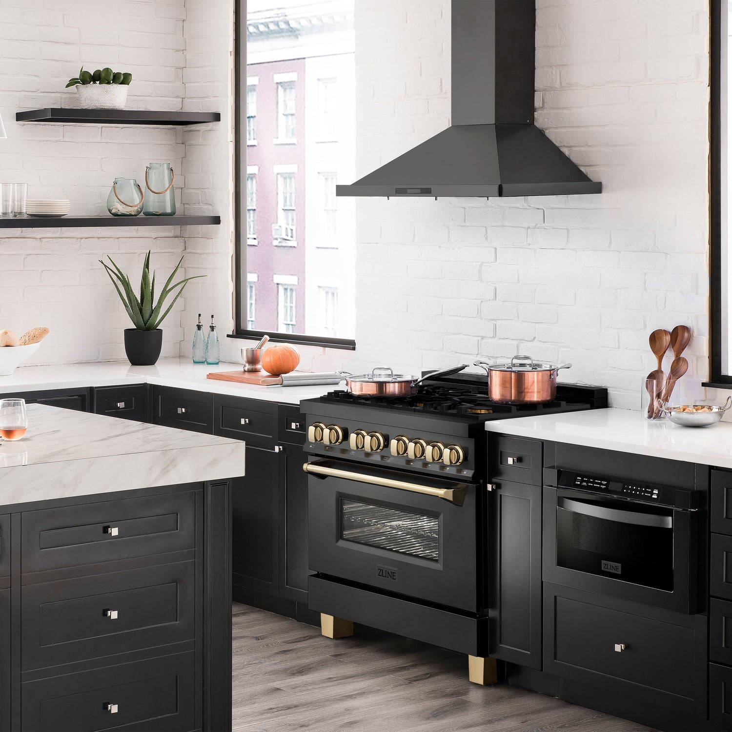 The ZLINE 36 Inch Range Hood in Black Stainless (BS655Z-36) comes fully equipped with a powerful, yet quiet motor and a stunning Gold Handle. Cook like a pro with this ZLINE Range Hood!
