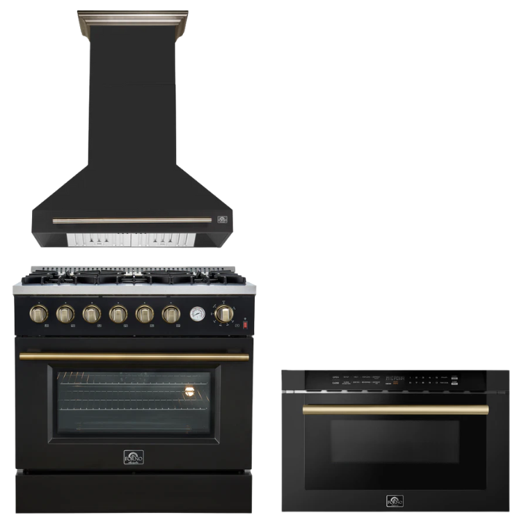 FORNO Appliance Package - 36" Gas Range, Range Hood, Microwave in Black with Antique Brass Accents