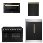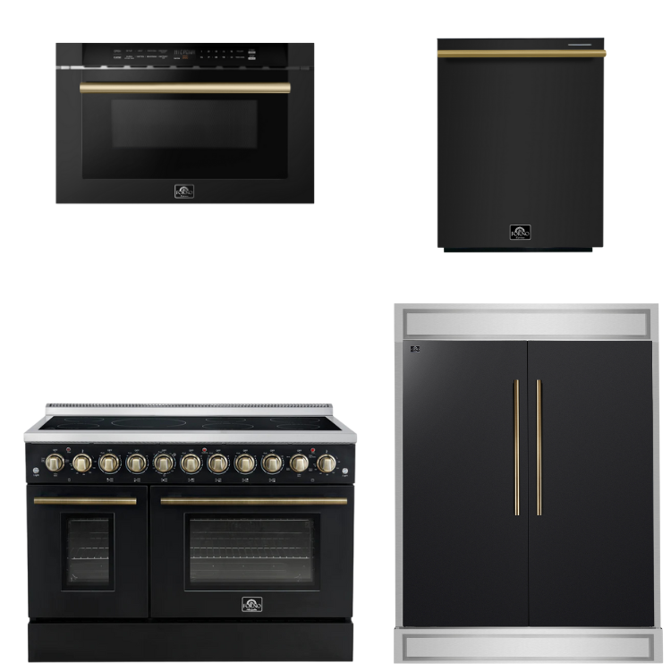 FORNO Appliance Package - 48" Electric Range, 60" Refrigerator, Dishwasher, Microwave in Black with Antique Brass Accents