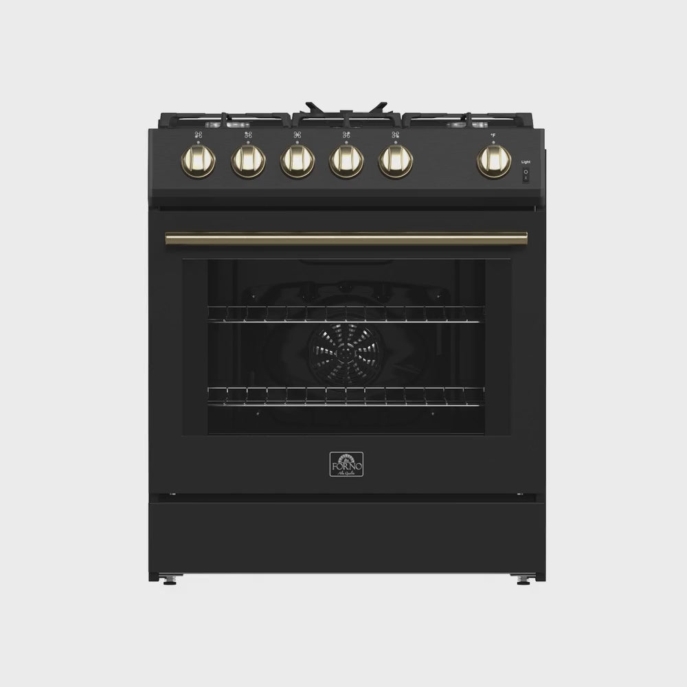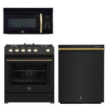 FORNO Espresso Package - 30" Gas Range, Over-The-Range Microwave and Dishwasher in Black with Antique Brass Accents, AP3-1116BLK-A9