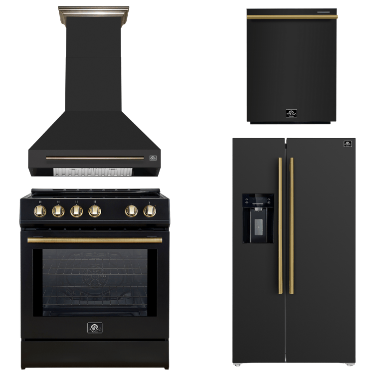 FORNO Espresso Package - 30" Induction Range, Wall Mount Range Hood, 36" Refrigerator with Water and Ice Dispenser and Dishwasher in Black with Antique Brass Accents, AP4-0982BLK-A17