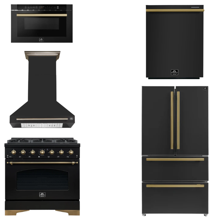 FORNO Espresso Package - 36" Gas Range, Range Hood, 36" Refrigerator, Dishwasher, Microwave in Black with Antique Brass Accents