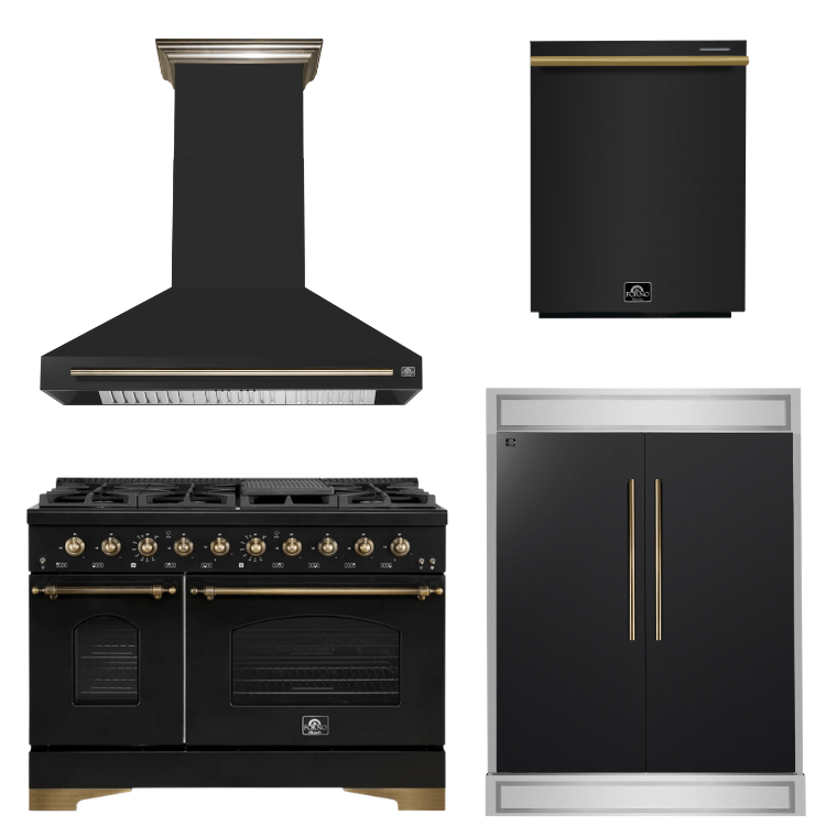 FORNO Espresso Package - 48" Dual Fuel Range, Range Hood, 60" Refrigerator, Dishwasher in Black with Antique Brass Accents