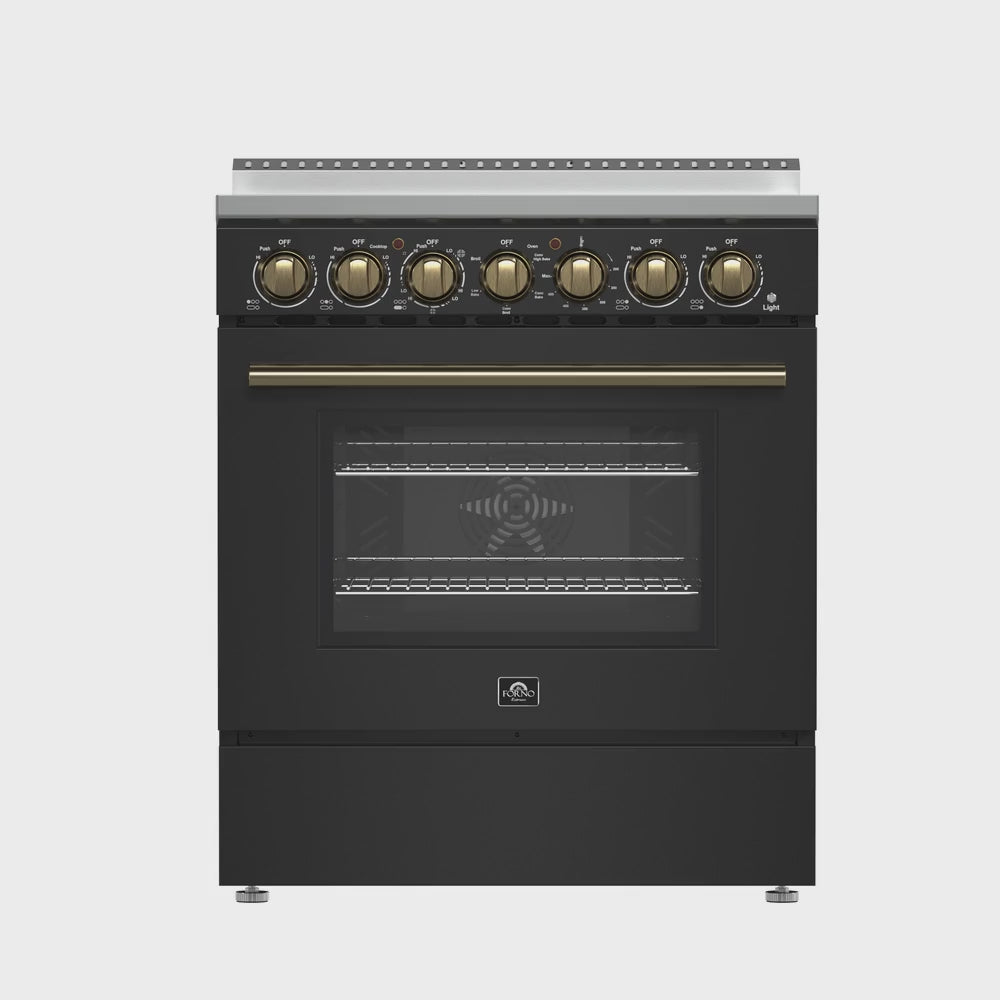 The Forno Paolo 30" Freestanding Electric Range in black delivers powerful performance and modern style. Its smooth ceramic glass cooktop evenly distributes heat across five radiant elements with a total output of 7,800 watts. The 4.38 cu. ft. true convection oven, powered by a 1,200-watt convection fan and a 3,800-watt bake and broil system, ensures faster, more consistent cooking. A hidden bake element simplifies maintenance, while bright halogen lighting and a large viewing window let you monitor dishes without releasing heat. Designed for versatility, this range also includes a 100-watt warming zone and a dual-element broiler for precise, high-heat cooking.