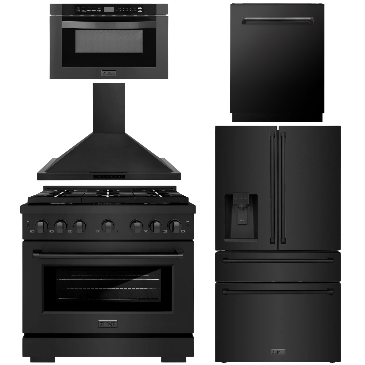ZLINE Appliance Package - 36" Gas Range, Range Hood, 36" Refrigerator with Water/Ice Dispenser, 24" Microwave Drawer and Dishwasher in Black Stainless Steel