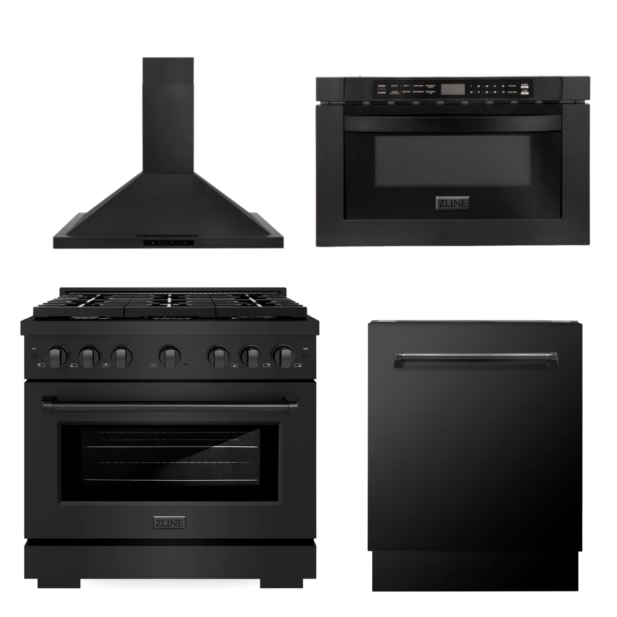 ZLINE Appliance Package - 36 In. Gas Range, Range Hood, Microwave and Dishwasher in Black Stainless Steel, 4KP-SGRBRH36-MWDWV