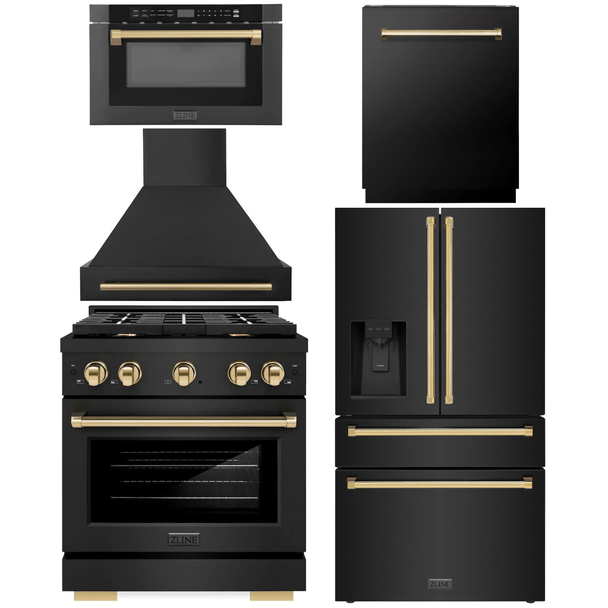 ZLINE Autograph Appliance Package - 30" Dual Fuel Range, Range Hood, 36" Refrigerator with Water/Ice Dispenser, 24" Microwave Drawer and Dishwasher in Black Stainless Steel with Champagne Bronze Accents