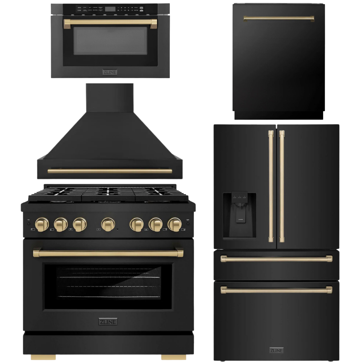 ZLINE Autograph Appliance Package - 36" Gas Range, Range Hood, 36" Refrigerator with Water/Ice Dispenser, 24" Microwave Drawer and Dishwasher in Black Stainless Steel with Champagne Bronze Accents