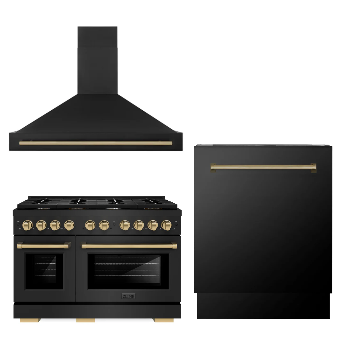 ZLINE Autograph Package - 48 In. Gas Range, Range Hood and Dishwasher in Black Stainless Steel with Champagne Bronze Accents, 3AKPR-RGBRHDWV48-CB