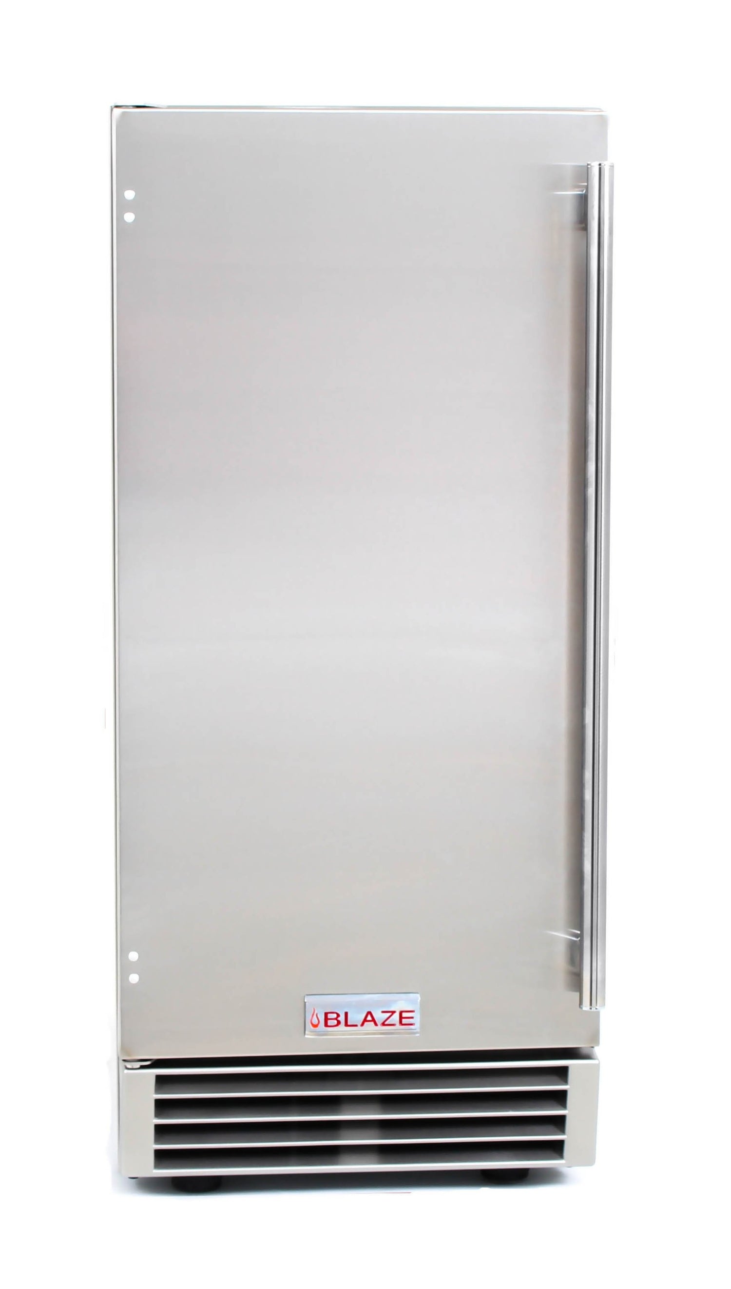 Outdoor entertaining is more enjoyable and convenient when you have everything in your outdoor kitchen. This outdoor ice maker eliminates unnecessary trips inside to get ice for your beverages. The Blaze outdoor ice maker can produce up to 50 pounds of cube ice per day and can hold 25 pounds in its removable bin. Inside the ice maker, a cool blue LED illuminates the contents, making things easy to see. The ice maker also includes a self cleaning mode and convenient one button operation. The Blaze ice machine features an in-line water filter which filters out impurities, ensuring the ice production is free of contaminants. The unit is made from durable stainless steel and features a reversible door to suit your specific needs. The front venting design allows it to be used in a built-in application, or it can be used as a freestanding unit. The bottom of the ice maker is equipped with four leveling legs for a perfect fit. It operates on environmentally friendly R134a refrigerant, carries an Energy Star rating and UL listing for outdoor use. This ice maker includes a stainless steel ice scoop, drain line and water line. Blaze Outdoor Products warrants this product to be free from defects in materials and workmanship for a period of one (1) year from the date of original purchase.