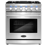 Elevate your home cooking experience with Cosmo's COS-EPGR304 30" Gas Range. This professional-style range boasts a spacious 4.5 cu. ft. oven capacity, perfect for cooking for a large crowd. The 5 sealed burners on the gas cooktop can handle all your pots and pans with ease, ranging from the largest to the most delicate of sauces. With varying BTUs (18,000, 9,000, 8,000, 6,000, and 4,000), this cooktop has the power and precision for all your cooking needs. The convection oven features powerful fans that evenly circulate air for fast and flawless cooking every time. From juicy roasts to delicate desserts, our special oven functions will help you create perfect dishes with ease. Crafted from durable, corrosion-resistant stainless steel, this 30" gas range is built to last. Plus, its removable backsplash offers the flexibility of both freestanding.
