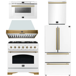 FORNO Antico Package - 36" Gas Range, Range Hood, 36" Refrigerator with Ice Maker, Dishwasher and 24" Microwave Drawer in White with Antique Brass Accents