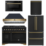 FORNO Antico Package - 48" Gas Range, Range Hood, 36" Refrigerator with Ice Maker, Dishwasher and 24" Microwave Drawer in Black with Antique Brass Accents