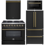 FORNO Galiano Package - 36" Dual Fuel Range, 36" Refrigerator with Ice Maker, Dishwasher and 24" Microwave Drawer in Black with Antique Brass Accents