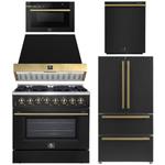 FORNO Galiano Package - 36" Dual Fuel Range, Range Hood, 36" Refrigerator with Ice Maker, Dishwasher and 24" Microwave Drawer in Black with Antique Brass Accents