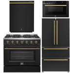 FORNO Galiano Package - 36" Gas Range, 36" Refrigerator with Ice Maker, Dishwasher and 24" Microwave Drawer in Black with Antique Brass Accents