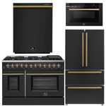 FORNO Galiano Package - 48" Dual Fuel Range, 36" Refrigerator with Ice Maker, Dishwasher and 24" Microwave Drawer in Black with Antique Brass Accents