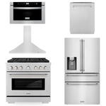 ZLINE Appliance Package - 36" Gas Range, Range Hood, 36" Refrigerator with Water/Ice Dispenser, 24" Microwave Drawer and Dishwasher in Stainless Steel