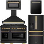 ZLINE Autograph Appliance Package - 48" Gas Range, Range Hood, 36" Refrigerator with Water/Ice Dispenser, 24" Microwave Drawer and Dishwasher in Black Stainless Steel with Polished Gold Accents