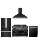 ZLINE Autograph Package - 48" Dual Fuel Range, Range Hood, Refrigerator, Dishwasher in Black Stainless, Gold Accents