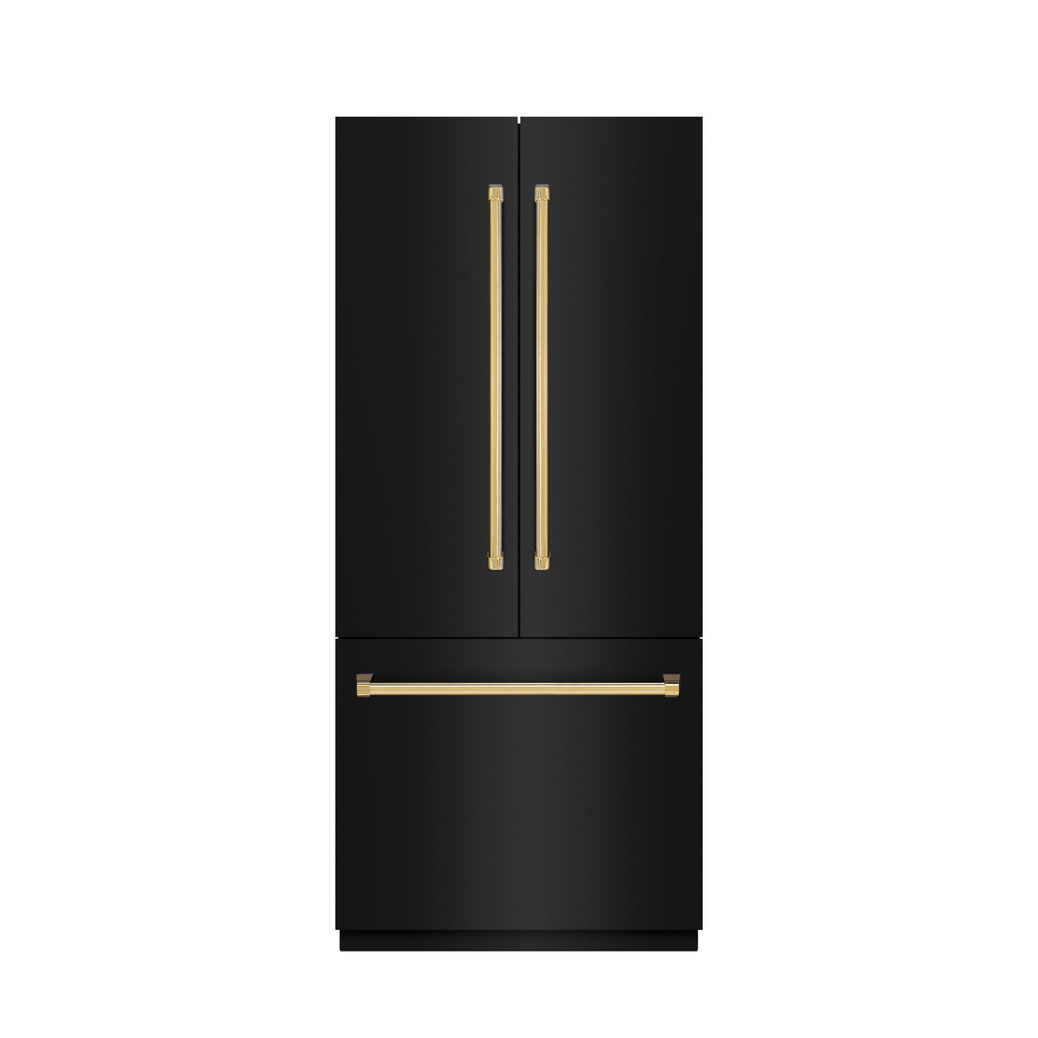 ZLINE Autograph 36" 19.6 cu. ft. French Door Built-In Bottom Freezer Refrigerator with Water Dispenser and Ice Maker in Black Stainless Steel with Graphite Gray Interior and Polished Gold Accents, GRBIVZ-BS-36-G