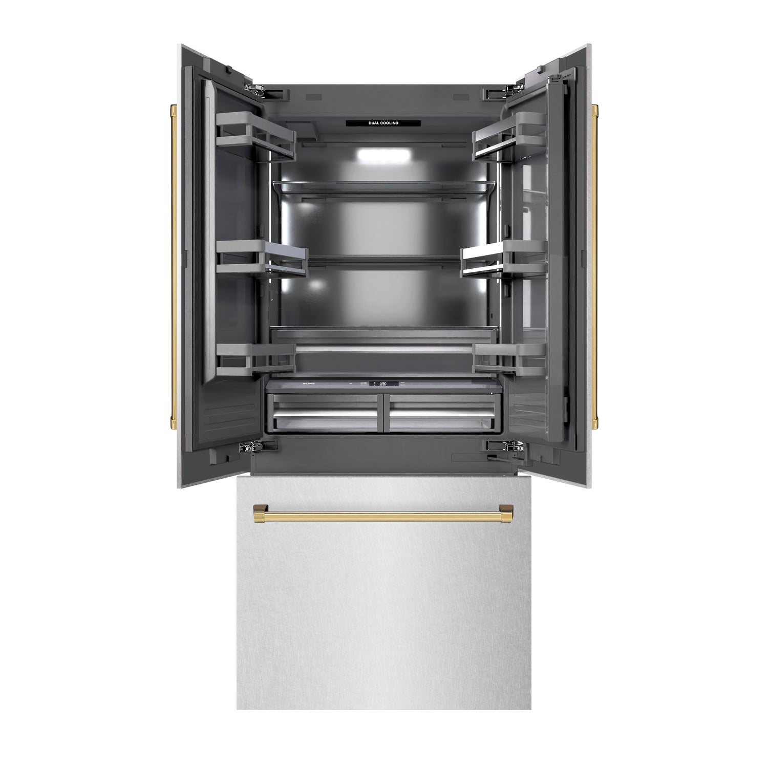 Luxury isn’t meant to be left desired—it’s meant to be attainable. The ZLINE Autograph Edition 36 in. 19.6 cu. ft. French Door Built-In Bottom Freezer Refrigerator with Water Dispenser and Ice Maker in Satin Stainless Steel with Graphite Gray Interior and Polished Gold Accents (GRBIVZ-SN-36-G) provides the ultimate upgrade to the center of your home by pairing premium dual cooling technology with enhanced storage capacity for multiple grocery items. Achieve ZLINE Attainable Luxury® excellence with innovative features designed to enhance your kitchen’s cooling and freezing capability.