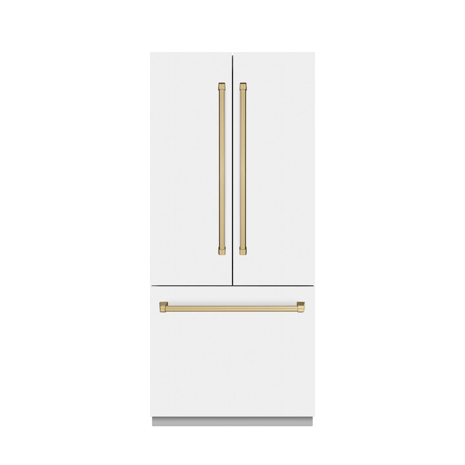 Luxury isn't meant to be desired - it's meant to be attainable. The ZLINE Autograph Edition 36" 19.6 cu. ft. French Door Built-In Bottom Freezer Refrigerator with Water Dispenser and Ice Maker in White Matte with Graphite Gray Interior and Champagne Bronze Accents (GRBIVZ-WM-36-CB) provides the ultimate upgrade to the center of your home by pairing premium dual cooling technology with enhanced storage capacity for multiple grocery items. Achieve ZLINE Attainable Luxury excellence with innovative features designed to enhance your kitchen's cooling and freezing capability.