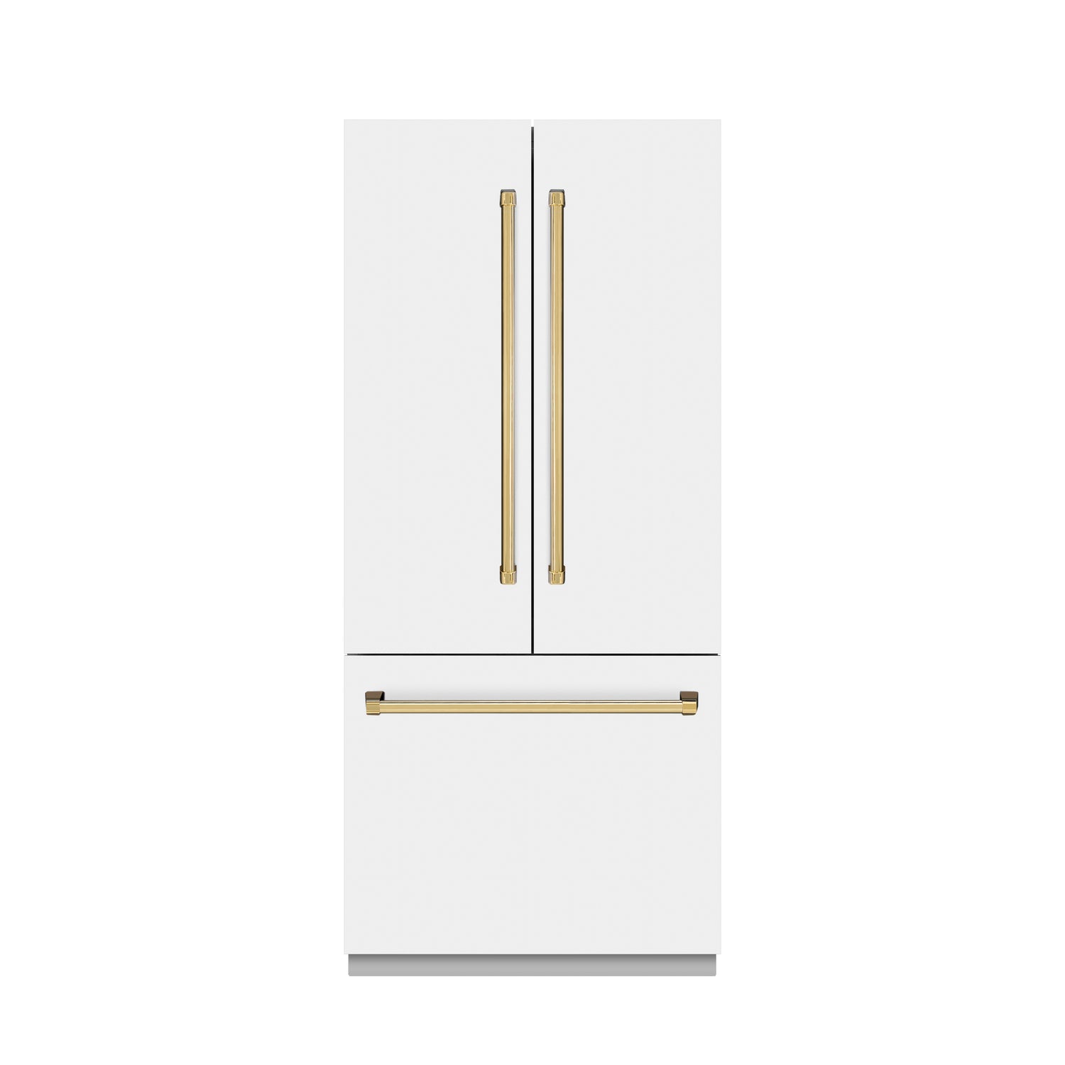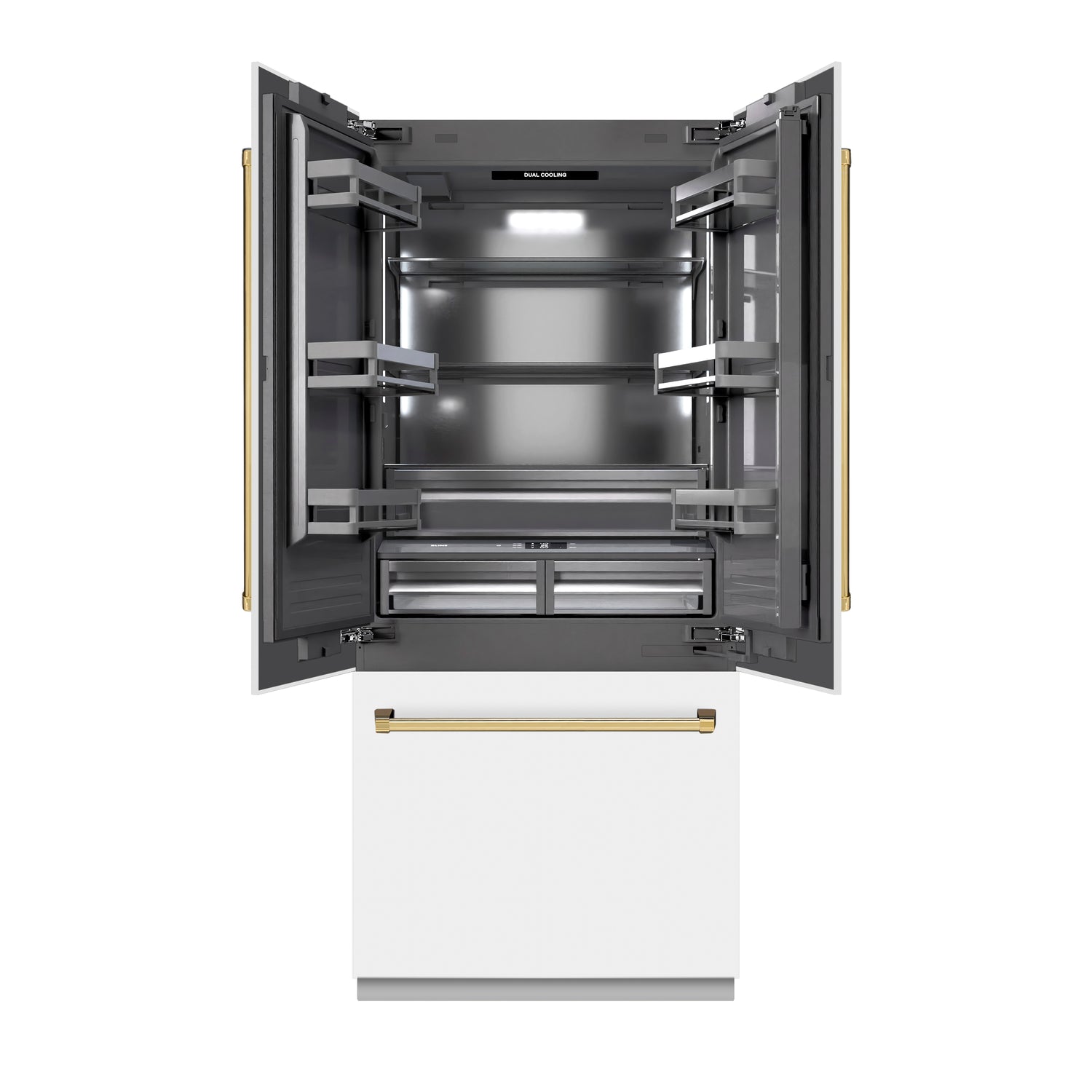 ZLINE Autograph 36" 19.6 cu. ft. French Door Built-In Bottom Freezer Refrigerator with Water Dispenser and Ice Maker in White Matte with Graphite Gray Interior and Polished Gold Accents, GRBIVZ-WM-36-G