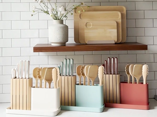 • Dimensions: Chef's Knife: 13.54"L x 0.89"W // Prep Knife: 11.85"L x 0.89"W // Bread Knife: 12.26"L x 0.89"W // Paring Knife: 7.87"L x 0.89"W // Kitchen Shears: 8.11"L x 3.24"W // Wooden Spoon: 12.09"L x 2.52"W // Wooden Server: 12.09"L x 2.52"W // Wooden Scraper: 12.09"L x 2.6"W // Wooden Spatula: 12.09"L x 3.27"W // Wooden Tongs: 12.09"L x 1.65"W