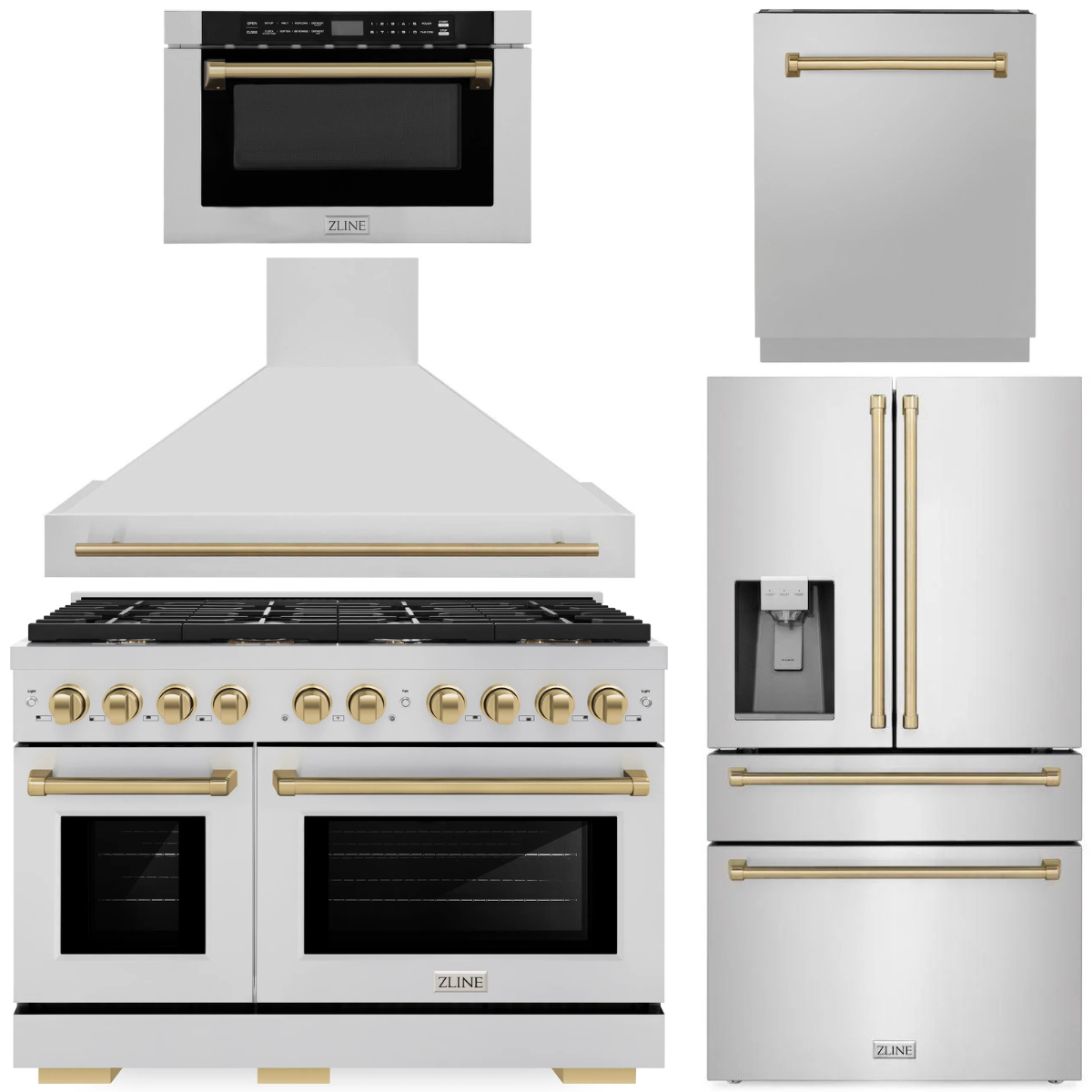 ZLINE Autograph Appliance Package - 48" Dual Fuel Range, Range Hood, 36" Refrigerator with Water/Ice Dispenser, 24" Microwave Drawer and Dishwasher in Stainless Steel with Champagne Bronze Accents