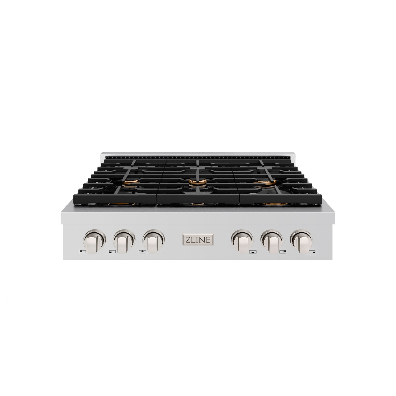 ZLINE Paramount 36" Gas Rangetop with 6 Brass Burners and Porcelain Cooktop in Stainless Steel, SRT-BR-36