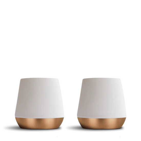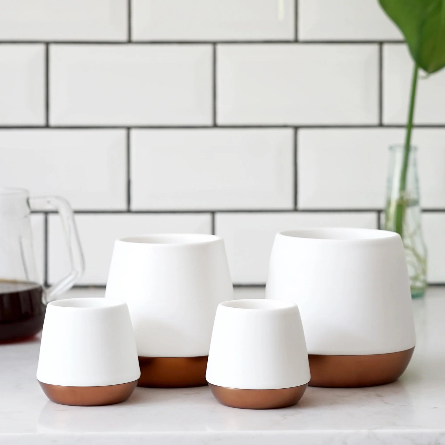 Bring a sense of occasion to your everyday ritual. Combining a matte ceramic body with a high contrast copper bottom, this is the tuxedo of coffee cups. The tapered design allows for easy gripping while the double wall keeps the exterior cool and condensation-free. Built for coffee but open to your top shelf beverages.