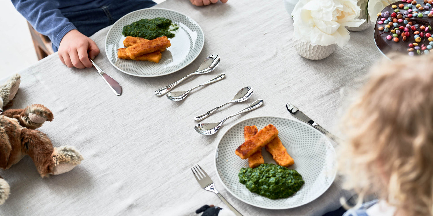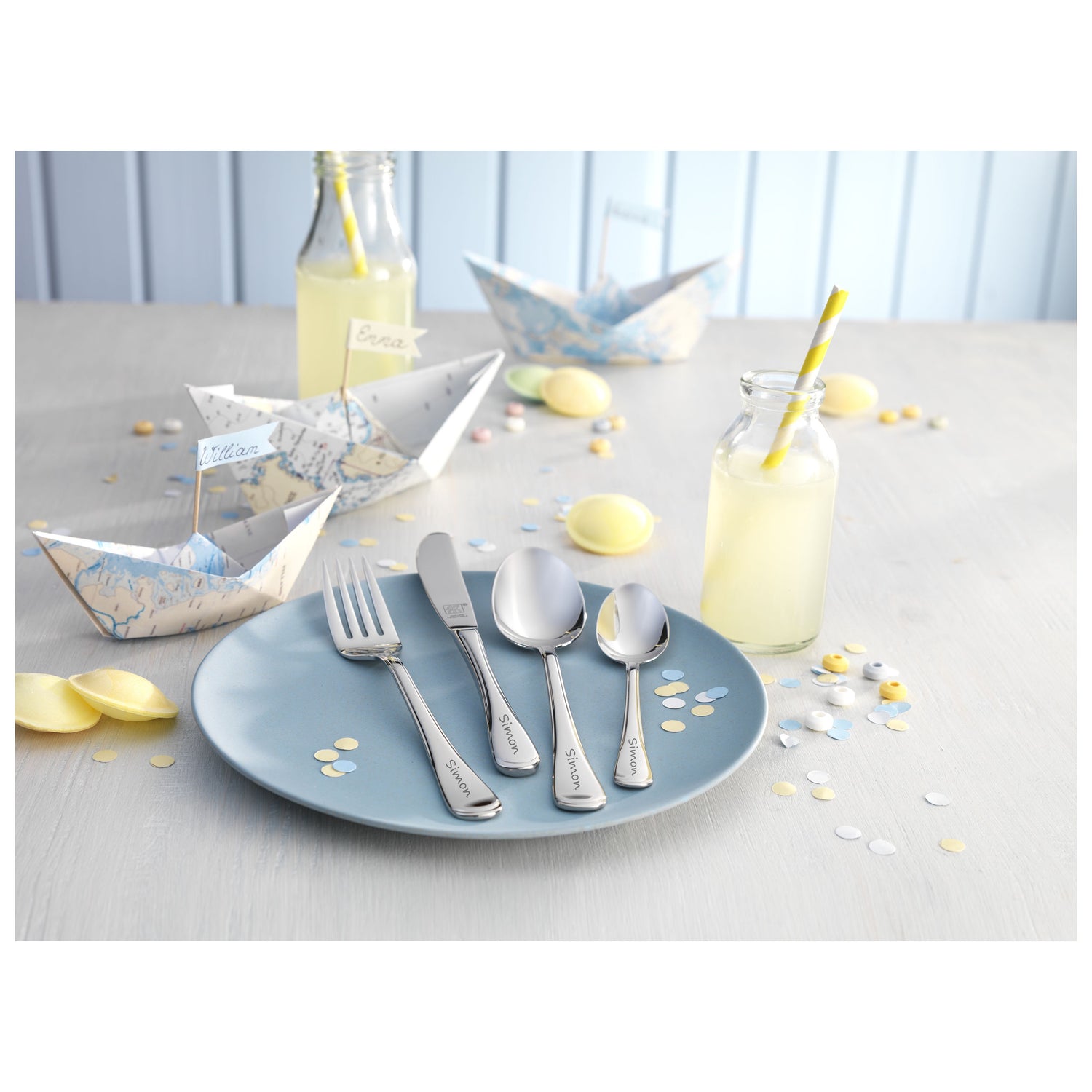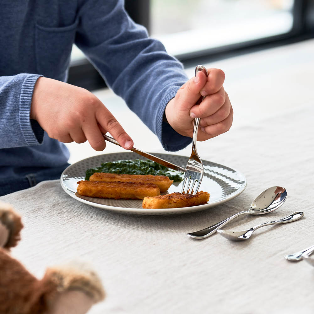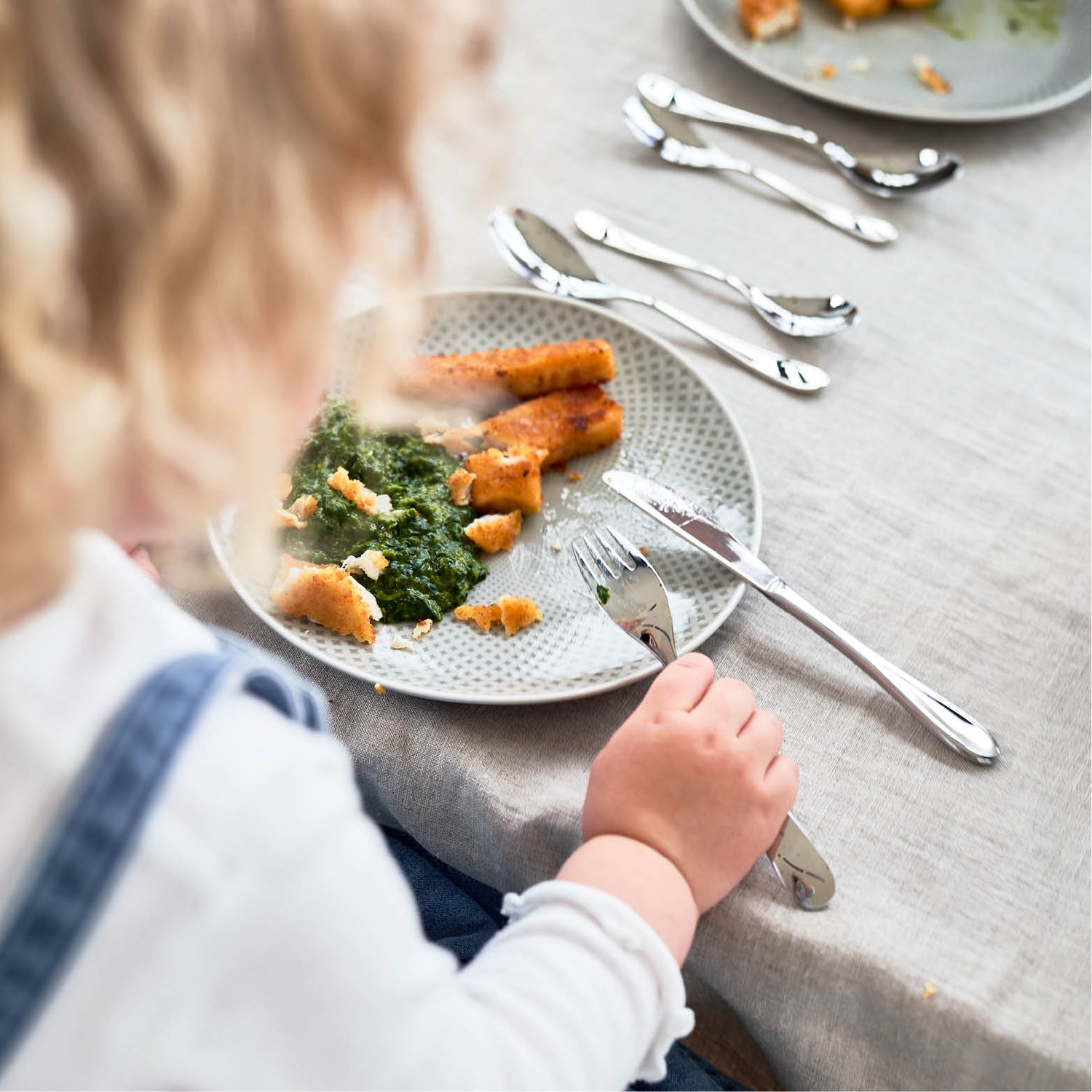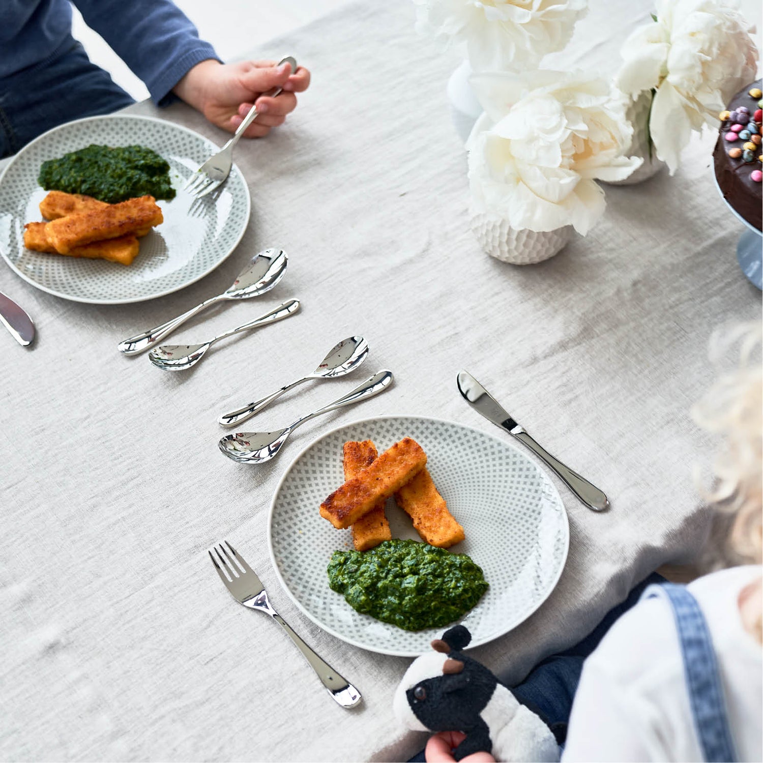 Twin Kids Filou brings a classic and minimalist aesthetic to flatware designed for little hands. With a highly polished mirror finish, this versatile design is a perfect complement to any table setting. This set features one, four-piece place setting.