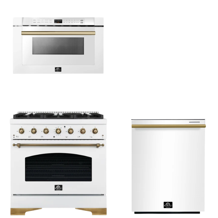 FORNO Espresso Package - 36" Dual Fuel Range, Dishwasher, Microwave in White with Antique Brass Accents