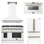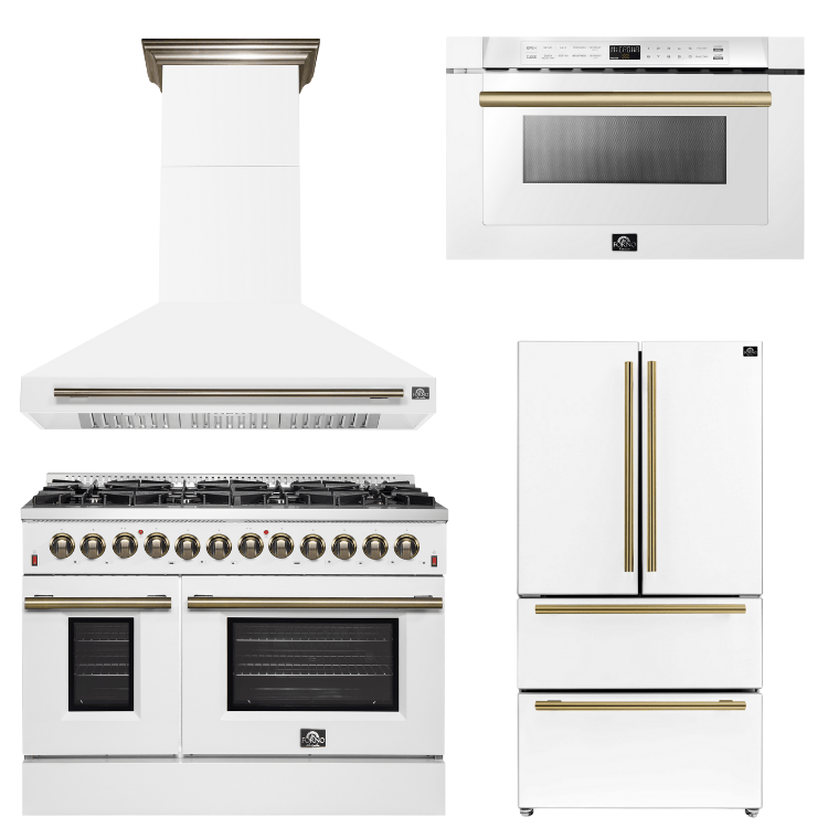 FORNO Appliance Package - 48" Dual Fuel Range, Range Hood, 36" Refrigerator, Microwave in White with Antique Brass Accents