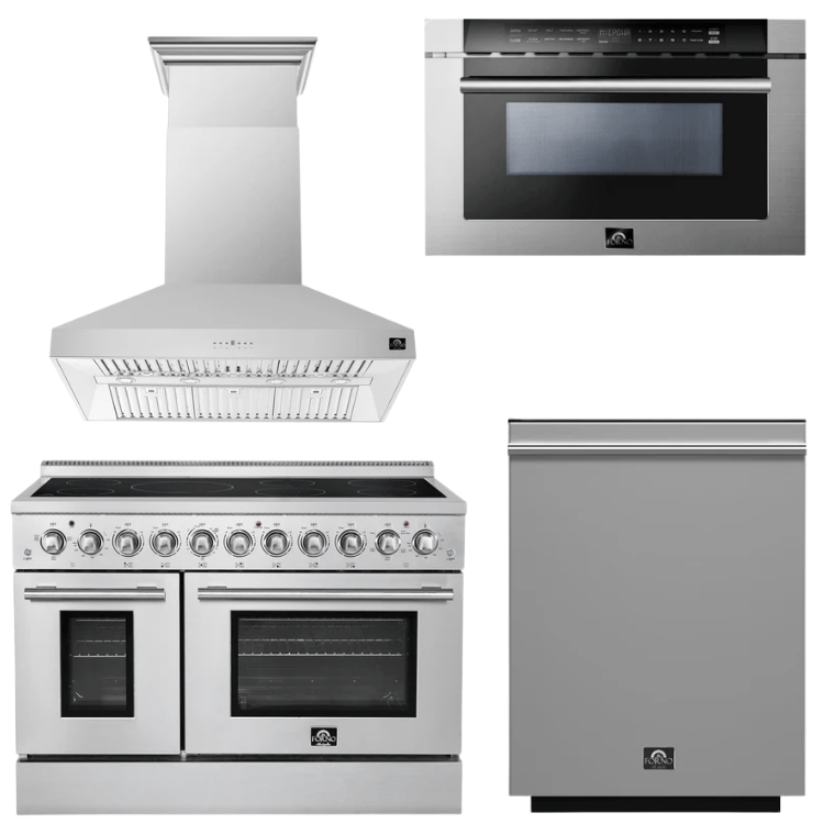 The Forno Paolo 48" Freestanding Electric Range in Stainless Steel combines power and polish for the modern kitchen. A smooth ceramic glass cooktop offers seven radiant elements with a combined 11,000 watts, while the spacious 6.7 cu. ft. black-enamel ovens use true convection with a 1,200-watt fan and high-output baking and broiling elements for fast, even results. Daily convenience comes from a hidden bake element for easy cleanup, bright halogen lighting, a large viewing window, a precise dual-element broiler, and a 100-watt warming zone for holding sides at serving temperature.