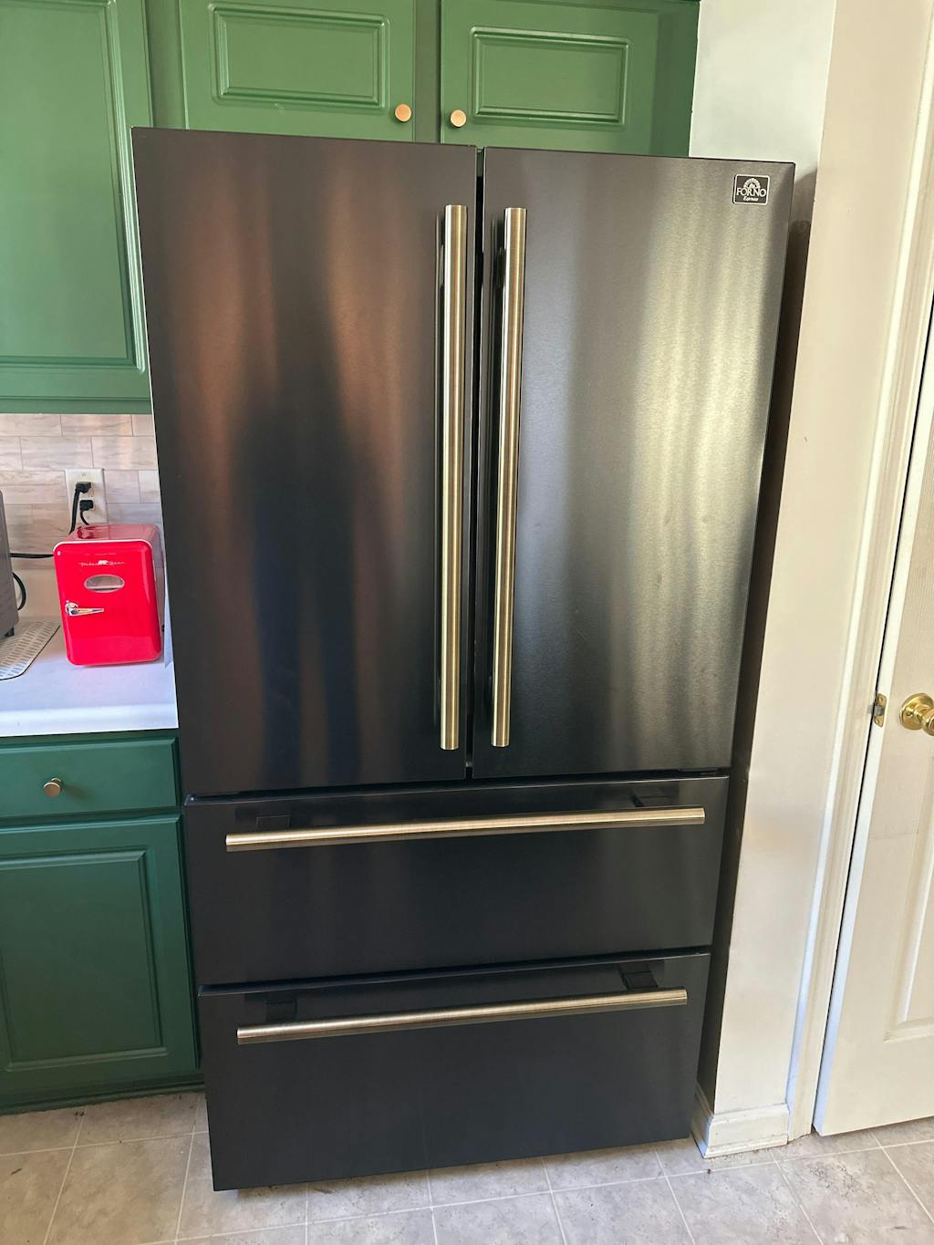 Have a stylish and efficient refrigerator in your kitchen with Forno Espresso's 36-inch White French Door Refrigerator. Its sleek design features customizable handles and advanced features, such as an automatic ice maker and fast cooling functions, while providing plenty of space with 19.2 cu.ft. capacity and adjustable shelving. Get energy efficiency and precise temperature control with ENERGY STAR certification and an inverter compressor, and easily organize with see-through drawers and door bins. Plus, brighten up your kitchen with high-efficiency LED lighting.