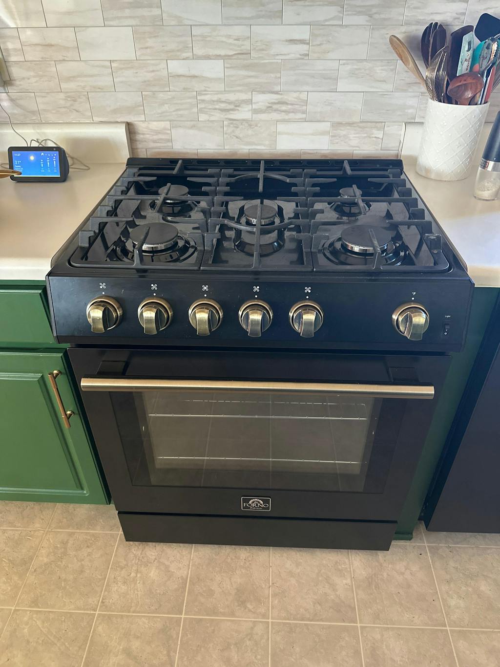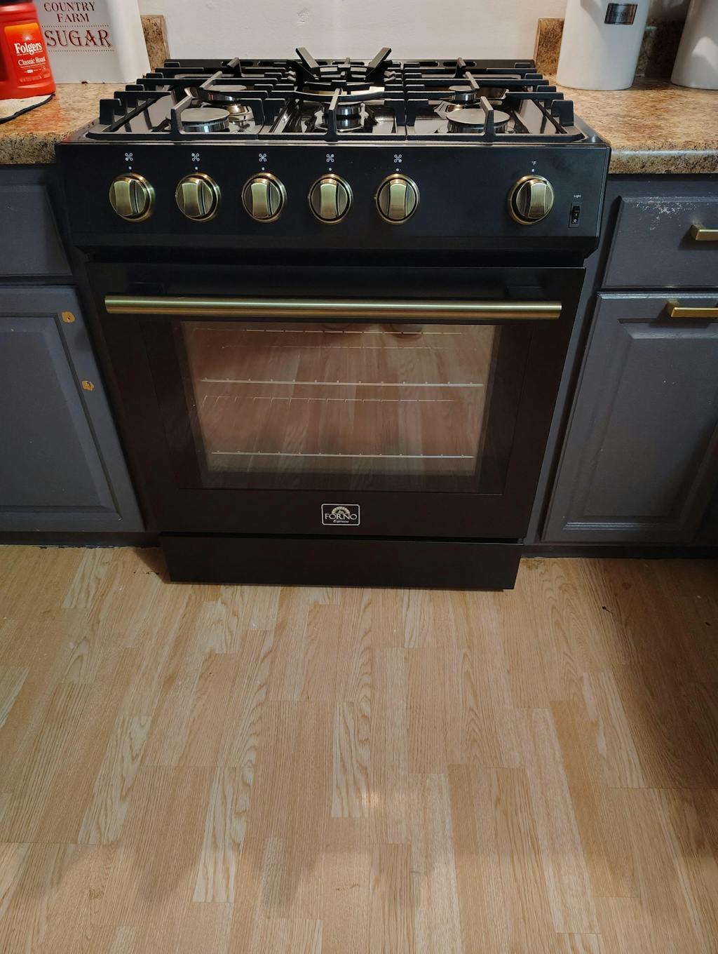 The Forno Leonardo 30" gas range in black combines modern design with professional-grade performance. Its powerful cooktop delivers 39,500 BTU across continuous cast iron grates, providing stability and effortless cookware movement. The deep recessed black enamel surface simplifies cleanup, keeping spills contained. The spacious 5.0 cu. ft. convection oven offers 22,500 BTU of broil and bake power, with two adjustable rack heights and a high-powered convection fan for even heat distribution. Designed for reliability, the auto re-ignition feature ensures consistent performance, while natural gas compatibility and an included propane conversion kit provide flexible installation options.