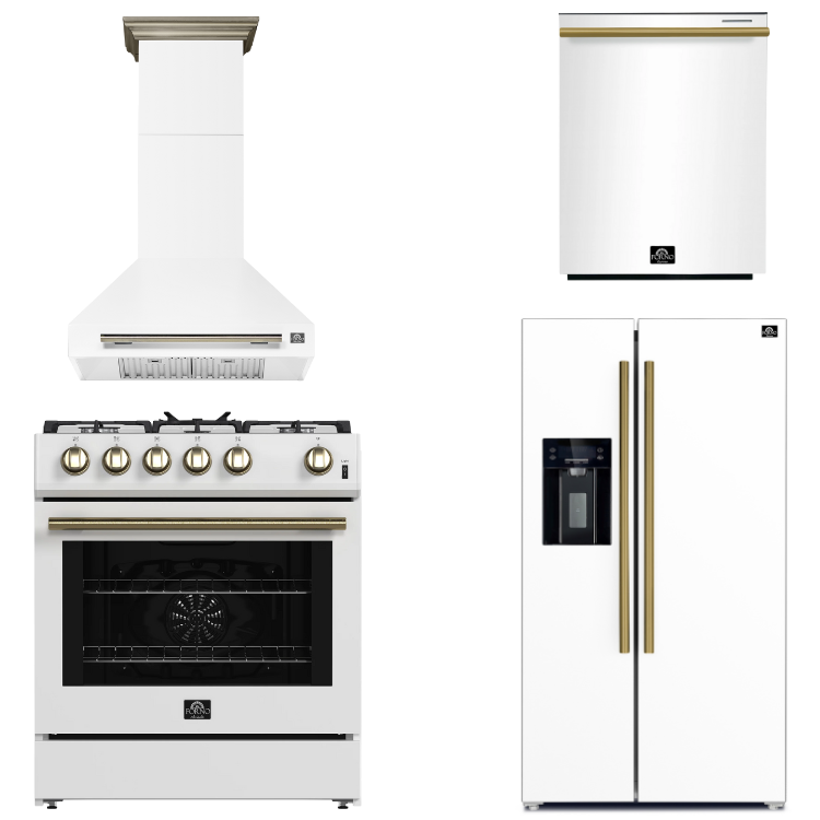 FORNO Espresso Package - 30" Gas Range, Wall Mount Range Hood, 36" Refrigerator with Water and Ice Dispenser and Dishwasher in White with Antique Brass Accents, AP4-1116WHT-A17