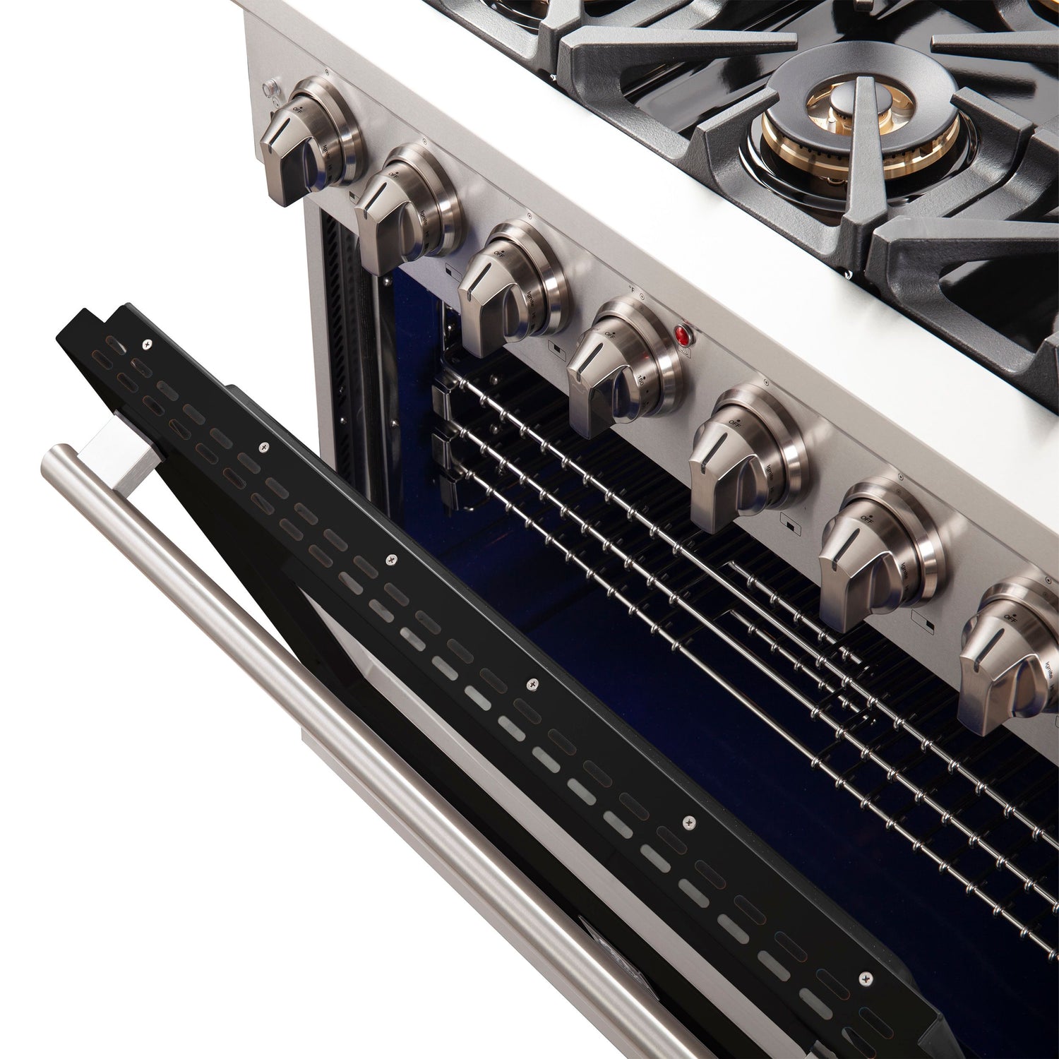 The Forno Capriasca 36 Inch Gas Range enhances your home kitchen with professional styling and performance through its durable and beautiful 304-grade stainless-steel design. The cooking surface features 6 sealed dual-ring brass burners, totaling 120,000 BTU. All burners, each at 20,000 BTU, can simmer precisely at 1,000 BTU. Continuous heavy-duty cast-iron grates facilitate easy sliding of pots or pans off heat over the enamel cooktop cavity, simplifying spill cleanup. The 5.36 cu. ft. gas oven, with a 30,000 BTU output and infrared red mesh broiler, enclosed in a blue enamel interior, offers optional convection for precise, and consistent cooking on multiple levels. For convenient viewing, a 3-layer glass oven door window is included. The package includes 3 telescopic stainless-steel oven racks, wok support, and an LP conversion kit. Additionally, zinc-coated illuminated metal knobs with bezel rings ensure enduring beauty.