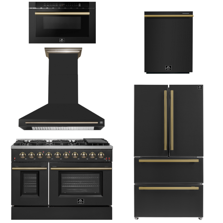 FORNO Appliance Package - 48" Gas Range, Range Hood, 36" Refrigerator, Dishwasher, Microwave in Black with Antique Brass Accents